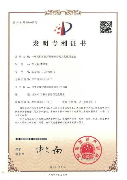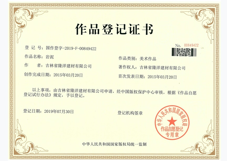 “巖泥”是吉林省隆洋建材有限公司生態(tài)安全與科技創(chuàng)新 “發(fā)明專利”;發(fā)明專利號:ZL 2017 1 0759564.7。