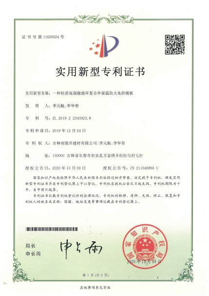 是吉林省隆洋建材有限公司生態(tài)安全與科技創(chuàng)新 “發(fā)明專利”;發(fā)明專利號:ZL 2019 2 2342013.8。