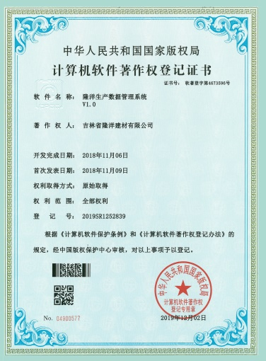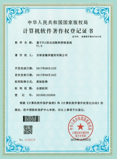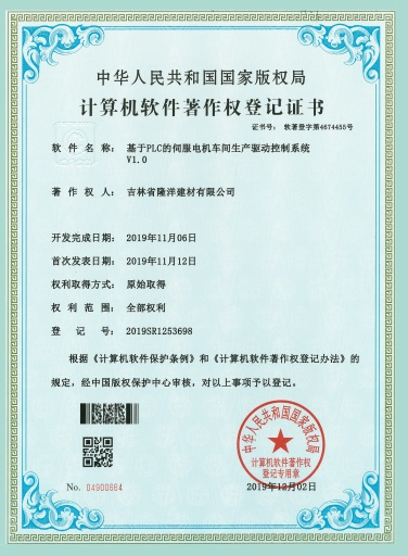 自2017年~2019年隆洋公司連續(xù)三年【榮獲裝配式墻板全自動化生產(chǎn)計(jì)算機(jī)軟件九項(xiàng)著作權(quán):證書號;第4673615號;第4674524號;第4673596號;第4673587號;第4673606號;第4675147號;第4673380號;第4674455號;第4673635號;】,