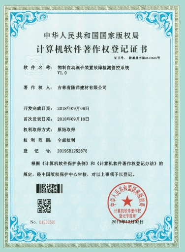 是吉林省隆洋建材有限公司生態(tài)安全與科技創(chuàng)新 “發(fā)明專利”;發(fā)明專利號:ZL 2019 2 0158616.X。