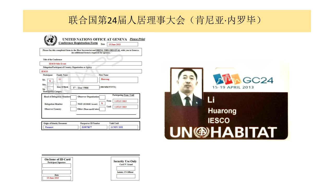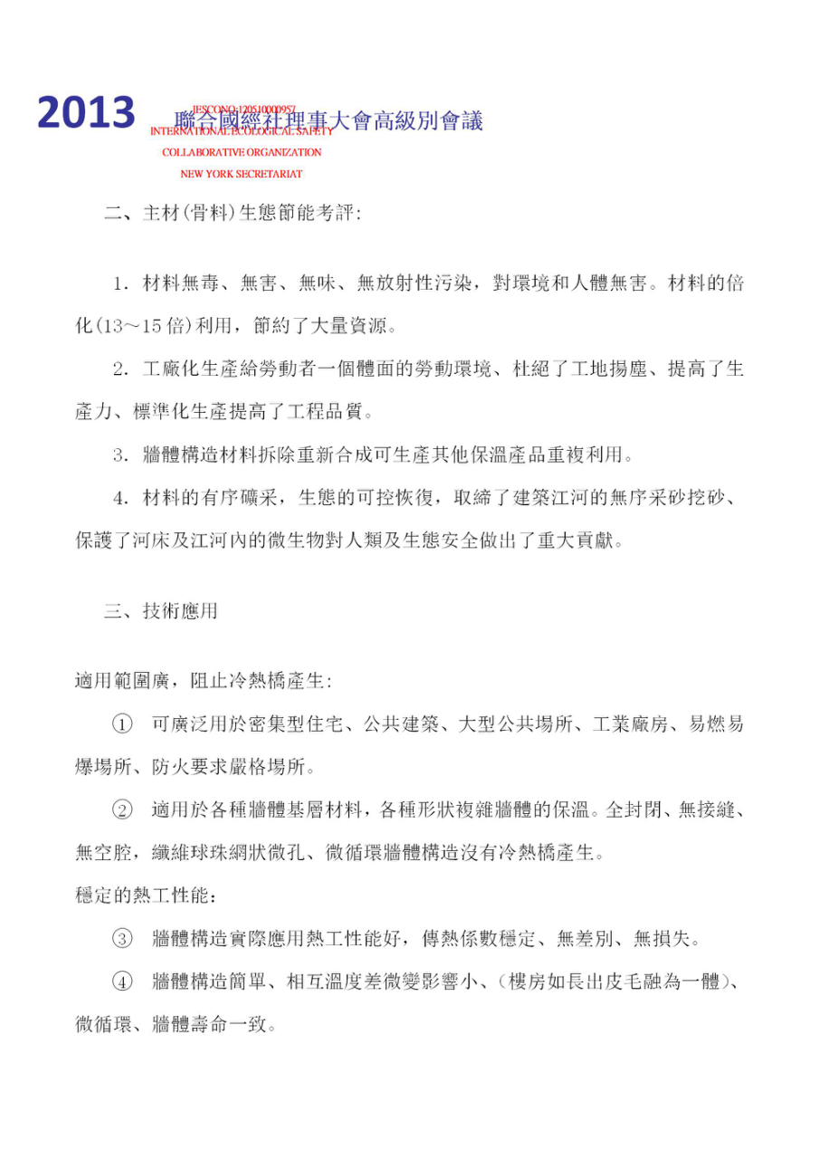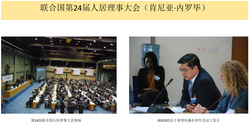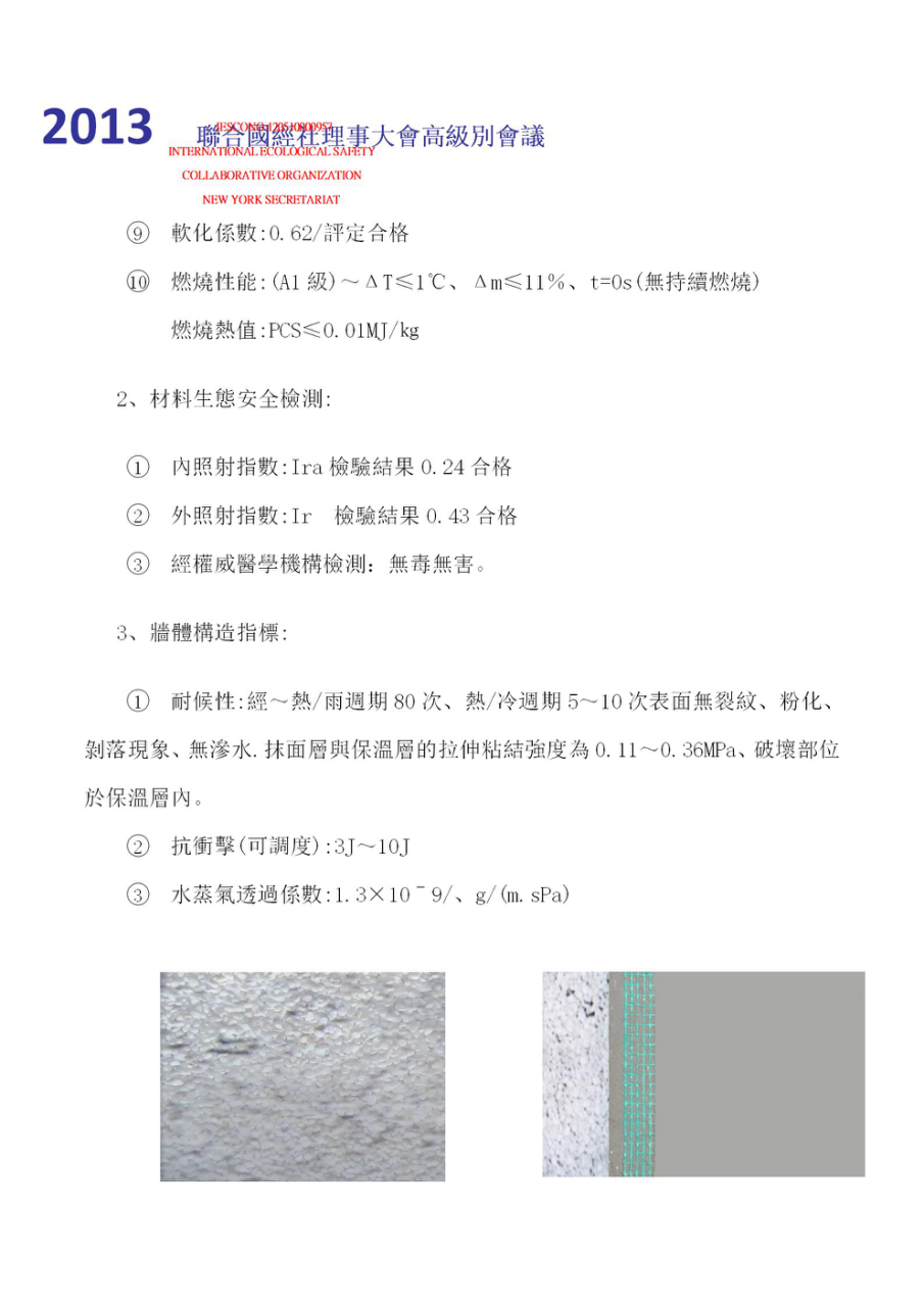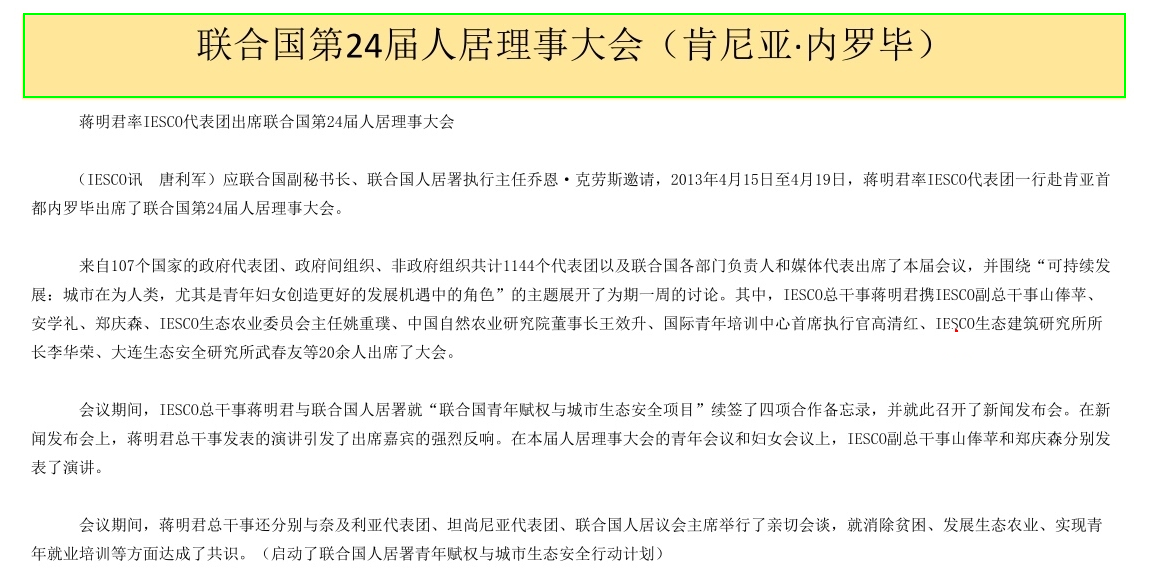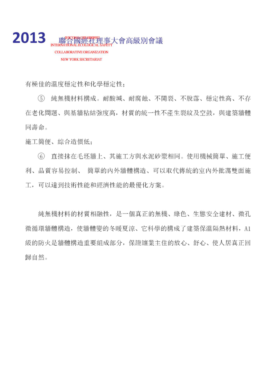 2013年4月參加聯(lián)合國人居署理事大會第24屆會議在內(nèi)羅畢召開——倡導(dǎo)并呼吁人居建筑生態(tài)安全。 同年7月聯(lián)合國經(jīng)社理事會高級別會議——《生態(tài)安全與科技創(chuàng)新專題會議》瑞士.日內(nèi)瓦,聯(lián)合國經(jīng)社理事大會高級別會議——產(chǎn)品獲人居建筑材料《生態(tài)安全與科學(xué)技術(shù)創(chuàng)新》鑒定。 同年9月參加2013歐亞經(jīng)濟(jì)論壇——中國.西安;再次倡導(dǎo)并呼吁人居建筑生態(tài)安全。
