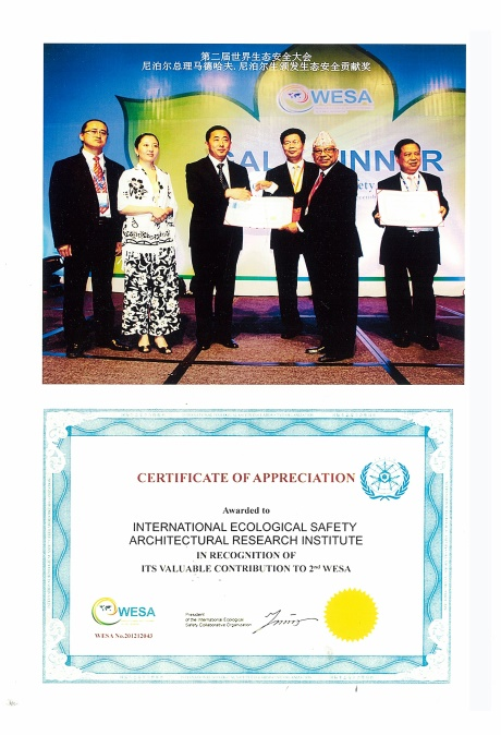 2012年參加第二屆世界生態(tài)安全大會印尼.巴厘島召開——榮獲人居建筑《生態(tài)安全貢獻(xiàn)獎》——由尼泊爾王國前總理馬德哈夫.庫瑪.尼泊爾頒發(fā)。